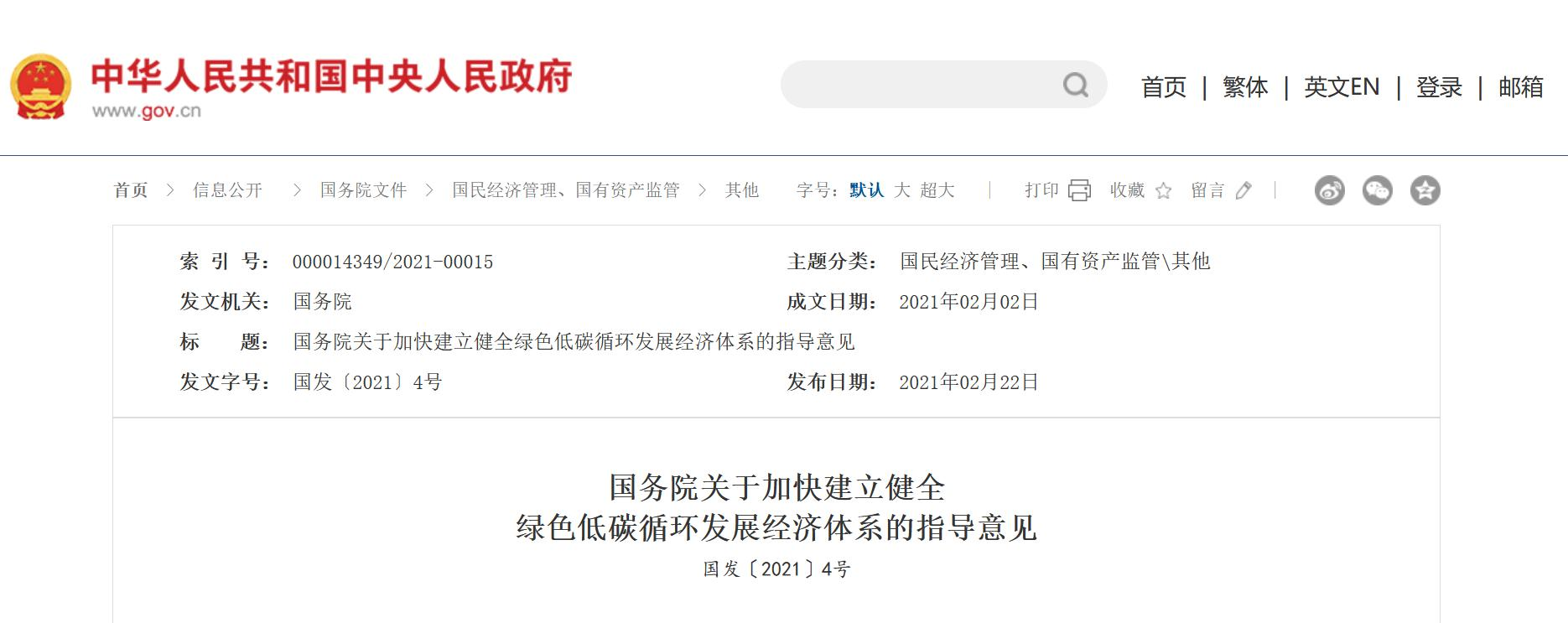月《国务院关于加快建立健全绿色低碳循环发展经济体系的指导意见》