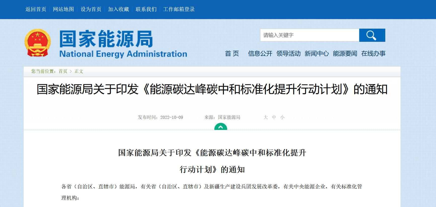 月国家能源局印发《能源碳达峰碳中和标准化提升行动计划》